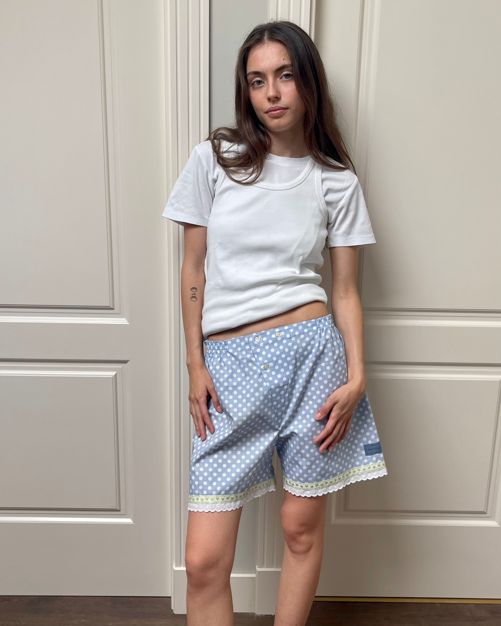 Detalle especial en el bajo con cinta de estrellas y volante.